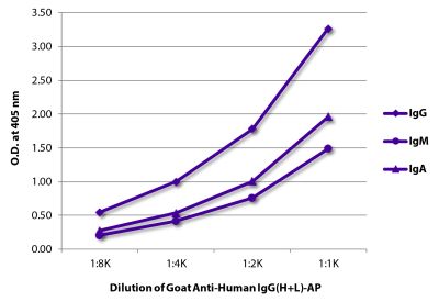 Goat Anti-Human IgG(H+L)-AP antibody with minimal reactivity to mouse, bovine, and horse serum proteins for use in ELISA assays.